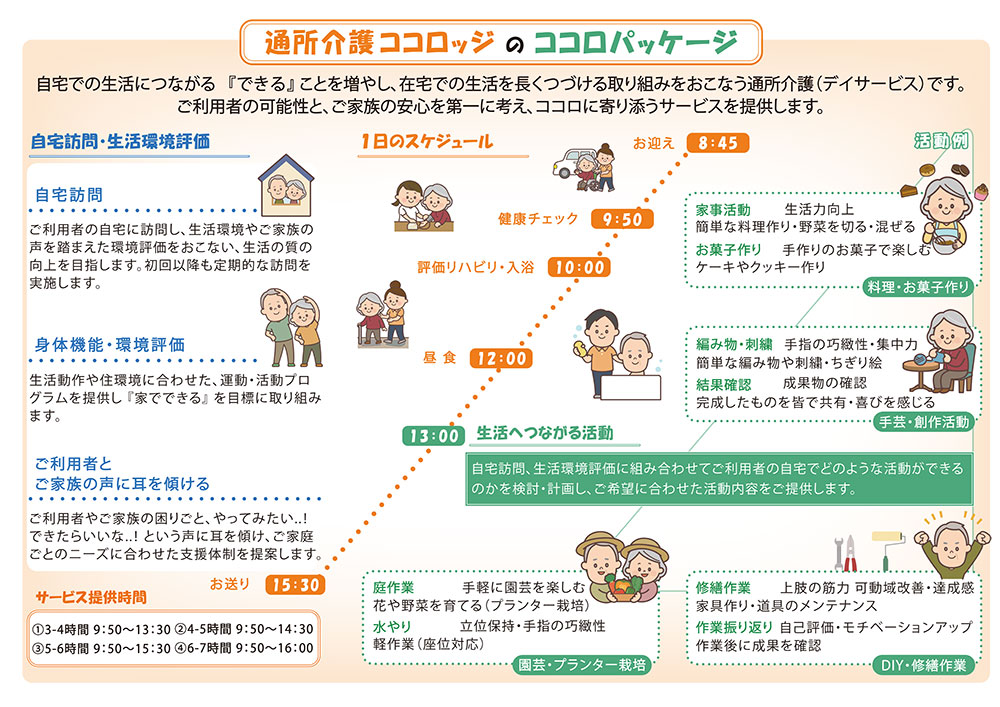 自宅での生活につながる『できる』ことを増やし、在宅での生活を長くつづける取り組みを行う通所介護(デイサービス)です。 通所介護CocoLodge(ココロッジ)は自分らしく暮らし続ける力を支えます。