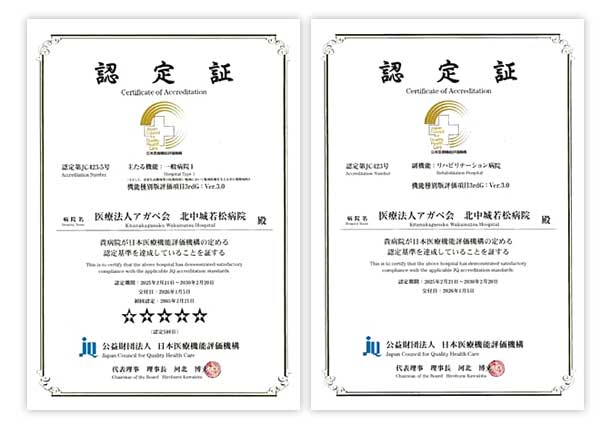 北中城若松病院は、公益財団法人日本医療機能評価機構による機能種別版評価項目3rdG:Ver.3.0の一般病院1(主たる機能)とリハビリテーション病院(副機能)を受審し、当院の機能を評価していただいた結果、2026年1月5日に5回目の認定をいただきました。